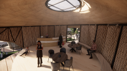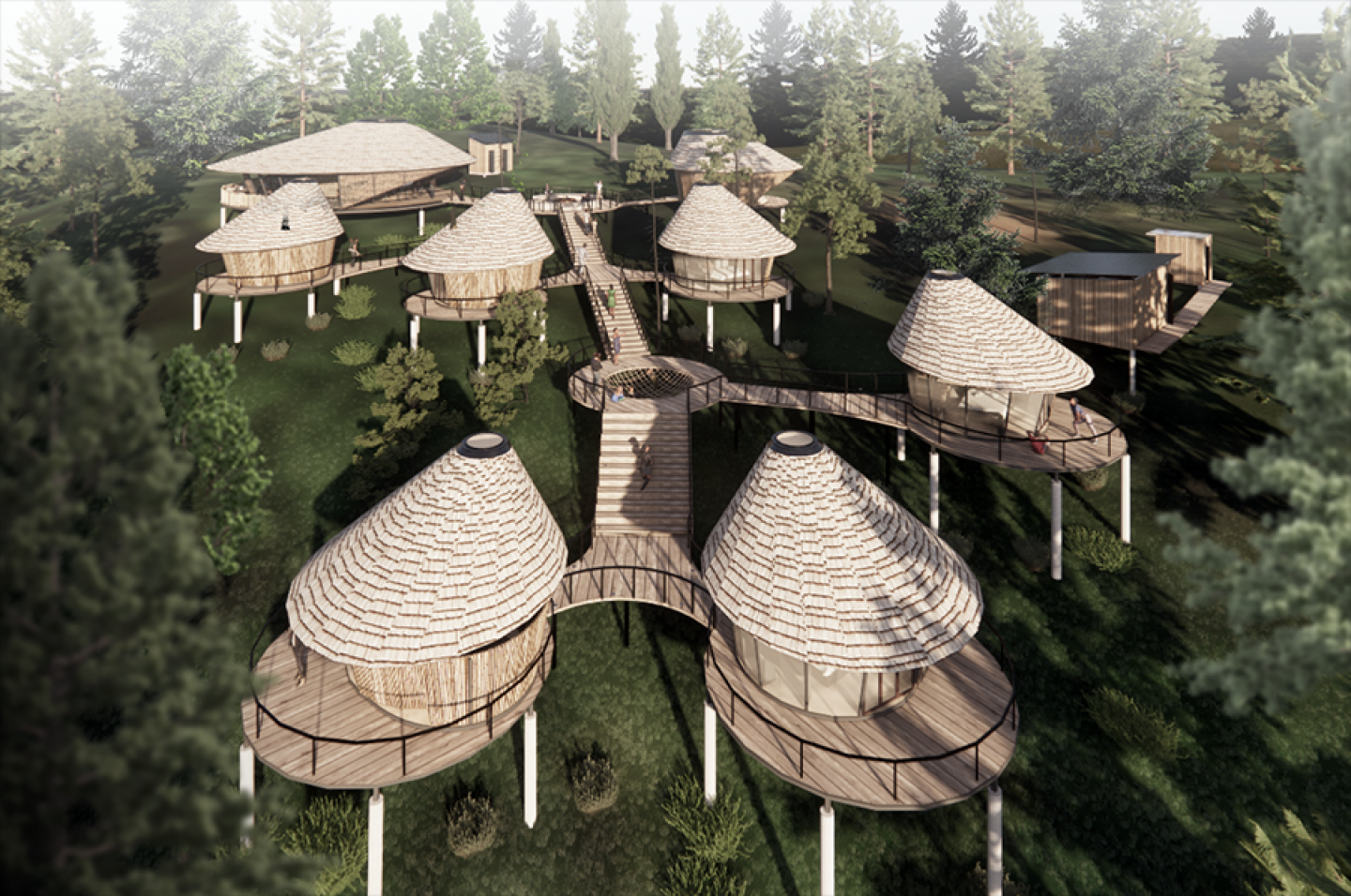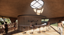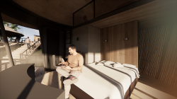 I designed the Glamping Villa that I chose to be located on a hillside filled with pine trees, far from the hustle and bustle of the city, which aims to relieve all the fatigue of the city. The shape of the villas is inspired by pinecones that fell around the site, connected to each other by paths.
