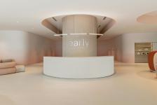 A monochrome palette is disrupted by salmon coloured soffits and wallpaper to highlight the curves of the space, and stone accents provide a soothing texture at points of client-staff interaction. Once inside the consultation rooms, muted colour combinations and natural stone countertops provide a tranquil environment.