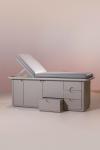 The front half of the space is left as open as possible to permit flexible programming and reflect the transparency of Early’s mission. Instead of using partition walls or dividers to separate its programmatic elements, full-height cove ceilings together with sinuous lines in the flooring and dynamic lighting subtly zone each space. Custom designed furniture, including modular lounge seating, privacy chairs, and phlebotomy pods paired with matching nursing trollies are spread throughout the space. For each custom healthcare furniture element, great care was taken to ensure proper ergonomics, hygiene, and privacy while remaining mobile and compact enough to permit a full view of the space from any angle. Materials selection was made with careful attention to sanitary and durability requirements, prioritising honesty of materials with respect to form and function without feeling overly clinical. This was accomplished through material, colour, and formal choices that destabilise expectations of a traditional medical facility.