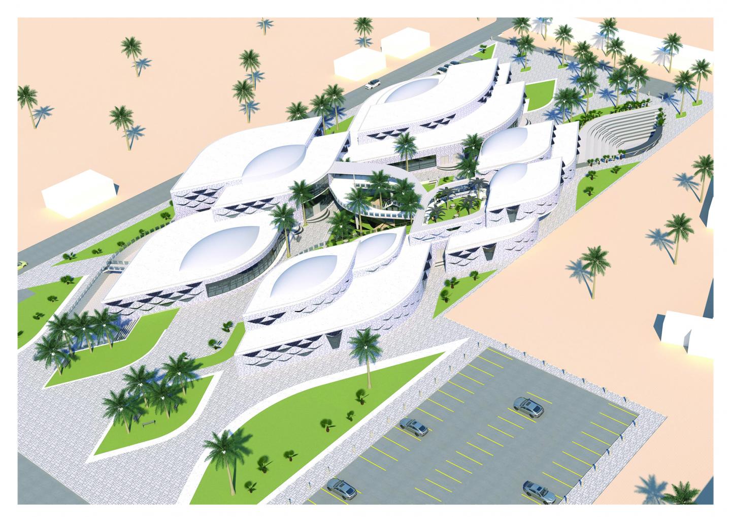 -The solar panels: are designed in an integrated manner with the shape of the glass openings in the facade to give an expression of the shape of palm barks.