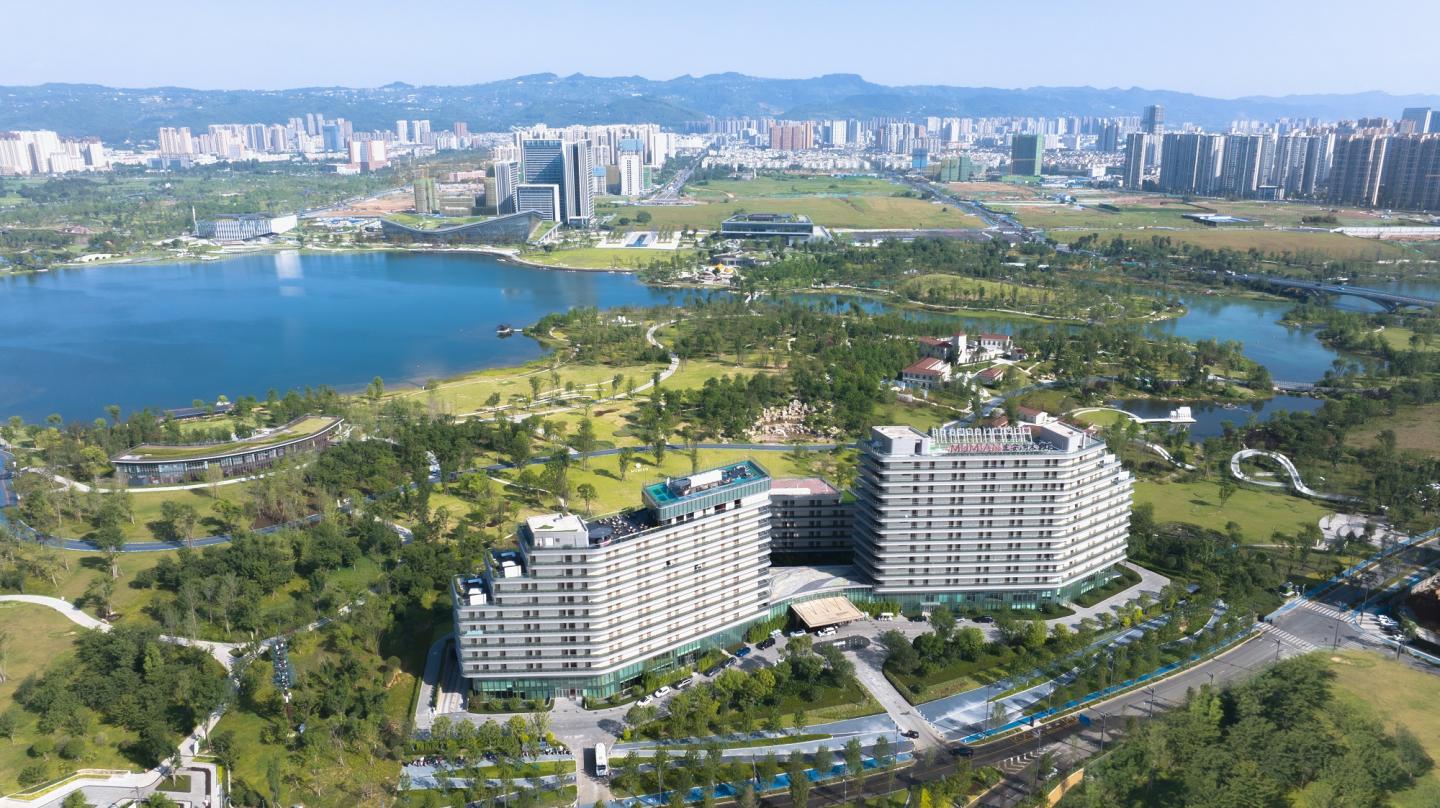 Led by Aedas Global Design Principal Kevin Wang, the new leisure destination fronts the Dong’an Lake and backs Longquan Mountains. It is a contemporary resort that integrates hotel, ecology, sports and retail.