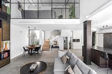 Another impressive architectural feature, which is present in this house and gives it its unique appearance, are the sloped ceilings that were originally covered with wood that is now painted in light colors and decorated with blocky beams that enhance and emphasize the motif of height and slopes. According to Roth, "In the living room, we emphasized the height dimension even more by designing an iron and wood library that forms the heart of the house. A power wall in the public space that brings together a variety of important functions such as a VRF air conditioning system with the TV screen, a beverage bar and display shelves for accessories and books."