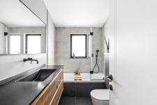 One of the great advantages of this property is, as mentioned, the adjacent grove bordering the backyard and it is evident that the design language of the interior of the house is also maintained in the outdoor environment: "We preserved the organic and natural appearance by using unhewn amorphous basalt stones - a black and natural stone that penetrates into the private space as well." Roth summarizes.