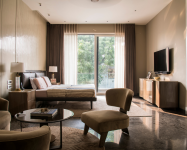 The interior palette is predominantly muted, with shades of beige and pops of colours from furnishings. The client’s desire for a luxury minimalist home drives the overall design language of the house. Even so, surprisingly whimsical details with hints of gold and silver make themselves apparent to anyone who cares to take a closer look. The grand staircase at the center of the house, for example, resembles a heavy (black) mass sitting on an expanse of white marble; the living room is adorned with a granite wall and hand-painted art pieces, while the dining room offers pops of whites amid the neutral tones of the rest of the home. The lounge area is the focal point of the home and is built to be able to glance into all the other spaces. With a blend of recreational and restful spirit being created alongside a frenetic cooking space, the lounge is purposely built as a soft edge to the kitchen area.