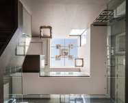 The lobby on the first floor, framed by glass railings, allows you to glance at the lounge and dining as you move upstairs. Natural light also plays a vital role in defining the openness of the interiors, not only with a large skylight at the entry but also with floor-ceiling windows in every space.
