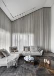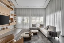 All the materials in the lounge run on the same color palette. The idea was not to create a colorful space but rather a serene and harmonious one. A modular sofa system was placed in its center, which can turn into an exceptionally cozy family lounging area in addition to the spacious family area located on the second level. An original wool vintage rug was placed under the sofa, and the curtains, which add another layer of softness to the space, were custom-made on-site due to the challenging ceiling shape & height.