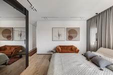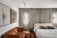 The master bedroom takes us to faraway places, designed in a more dramatic, intimate, and sensual style. Horowitz combined orange and rust elements that can be seen in the artwork, the rug, and the sofa: “The cupboard, with a mirrored facade, was positioned across from the bed and creates reflection and depth”, he explains. “The walk-in wardrobe was broken down into components, in the same manner as molecular cooking. it embraces the walls and is transparent in parts, thus doubling the space visually”. An enclosed area was created where a mirror and tv screen were positioned, and further along, there is a corridor that leads to the office.