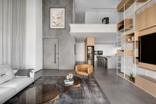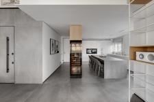 The designer used the entrance and lounge walls to create vertical pieces that emphasize the double headroom. The original entrance door was replaced with a 2.8m high door that is embedded into the wall. The wall was tiled with 1.2x2.8m gray porcelain slabs that emphasize its height and run up to the ceiling of the gallery level.