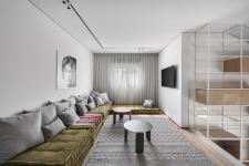 The kitchen was divided into areas: along the length of the space, Horowitz designed a white storage unit for all that a modern kitchen needs, with the door to the master bedroom planned further along. A 3.5x1.2m kitchen island abundant in storage was positioned in the center and is used by the family for casual dining. When entertaining guests, the family usually does so on the well-kept balcony.