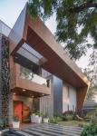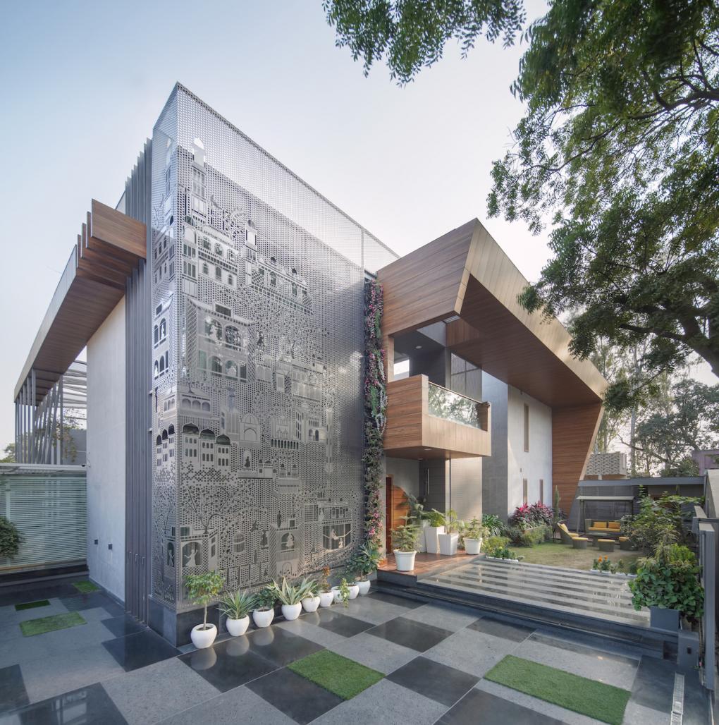 The Facade of “Aaroh” is an extension of its corresponding Internal Spaces, where the soul of its internal Areas transcends to its outer Fabric in a seamless fashion. A good part of the Facade which is projected from the North Eastern Zone has mostly Glazing, which is further accentuated by creating a Laser-cut MS Jali Screen as an external Skin. The initial purpose of the Jali was to cater to the Security Concerns of the Client, but through an “out of the box” approach, we were able to create a story board running across the two Floors, the story that celebrates life by taking inspirations of a bygone era which was rich in Culture & Social interactions. The Screen further evolved as a visual delight from the Indoors as well as the Outdoors while interacting with the passerby in a cheerful & joyful manner. The block projected from the South Western Zone, has been mostly kept Solid with a just few fenestrations, this creates a contrast between the two blocks in the Facade, accentuating Solidity in one & Permeability in the other. These two blocks are then connected via an inviting volume draped in HPL, that highlights the magnitude of the width & empowers the true perspective of the House while framing & crowning the Facade in style.
