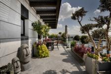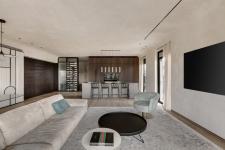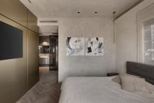 The master bedroom includes an en-suite bathroom with glass windows that create a reflection between the spaces, presenting a much bigger space. The en-suite continues with the same overall color palette, through the use of extra-large 1.5x3m tiles and a Corean cabinet. The bed faces the safe room, which is used as a walk-in wardrobe and the exit from the master bedroom leads to the jacuzzi on the balcony.