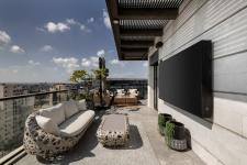 The penthouse was originally a five-bedroom property and was redesigned to meet the needs of its new owners, with particular attention given to the master bedroom and the balcony. The interior of the standard entrance door was covered with a dominant wood veneer that continues across the entrance wall and conceals two doors, one to the guest toilets and another to the son’s bedroom.