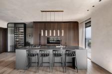 The kitchen was fitted with tall cabinets in wood cladding, that continue the L-shaped space through to the family corner. The carpentry unit that serves the kitchen, conceals a utility room and audio systems. A gray kitchen island with a built-in sink and stove top was positioned in the center of the space. The coved ceilings continue through the kitchen, giving the space a softer feel.