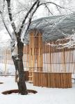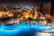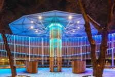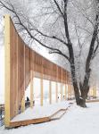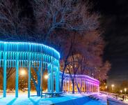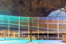 The wood used in the manufacture of the "fencing" retains its tactile warmth and natural tact to the surrounding space and objects. With the onset of darkness, the “fencing” turns into an extended screen with flashes of color and light, transforms into a rhythmic radiance, accompanied by a traditional musical flute instrument “kuvikla”, including us in a round dance, virtually filled with shades of a fair carrousel, and then along the movement of the alley of images to the pathos of the organ, ascends to the cosmism of the Northern radiance. All this happens in the spirit of contemplation against the background of the church bell ringing, which turns our consciousness upward, towards the branchy crowns of trees glaring against the background of the night sky.