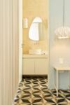 Underneath the corridor that connects the second floor can be found a half bathroom and the Equipment room that services the house, covered in a design element that resembles the pattern of the flooring found in the original house, which can now be found in the bedrooms.