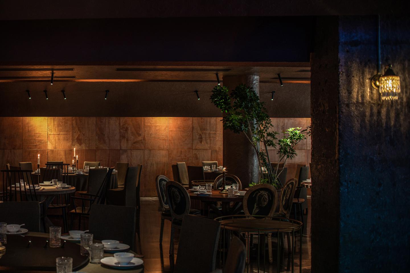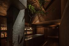 The cement structure columns jack up three sections of huge earth-colored arc canopy which, like cave fragments loaded into the building, wrap up the whole hall and a 20-meter-long giant fish tank. Lush green plants embrace the dining tables of diversified shapes and materials. Deliberately set lights and jumping candle flames let the dim, indolent undersea cave tree shadows interweave with the warmth. Coming to the private rooms deep in the cave without natural lighting along the foot traffic, we may see the 2,000k color temperature light shines on the rough, dark earthy walls and ceiling, like dim fire mirrored from the furnace, creating an implicit beauty of the light and shade.