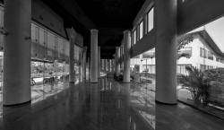 The north east and north west corners of the building too are lifted creating singular large volumes at these ends to allow visual contact between floors while housing a cafeteria and a library.