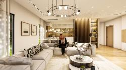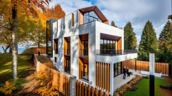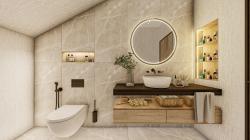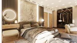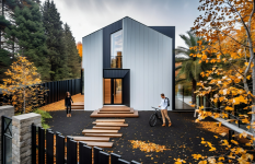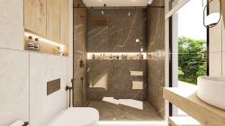 The project location is located in Istanbul, Turkey. A gable roof design was made by taking into account the municipal rules in the Sariyer district of Istanbul. The surface coating on the first floor descends to the garden level and provides the unity of the 3 floors. The building is entered from the middle floor of the 3-storey building. The slope of the land has allowed garden design at 2 different levels. A rich design has been achieved on the façade by making chamfers in different proportions on the windows. In the design of the room in the attic floor, windows that continue on the roof and the wall are used. The main entrance door of the house on the entrance facade is located asymmetrically to the left of the facade. The reason for this is that stairs are designed for easy access to each floor on the right of the entrance. The staircase design is fully illuminated with a vertical glass opening on the side. There is a large terrace in front of the rooftop room. The living room and kitchen of the house are designed as a single space together. The kitchen is designed with farm sink and different color alternatives. By designing a floating vanity in the bathroom and WC of the house, it was tried to give the feeling that these small spaces are bigger. LED-lit mirror is used in the cloak room that comes under the stairs. In the master bathroom, lighting is provided with a ceiling-mounted sconce. The walk in shower area in the master bathroom was designed with granite and emphasized in color and texture in the bathroom.