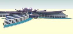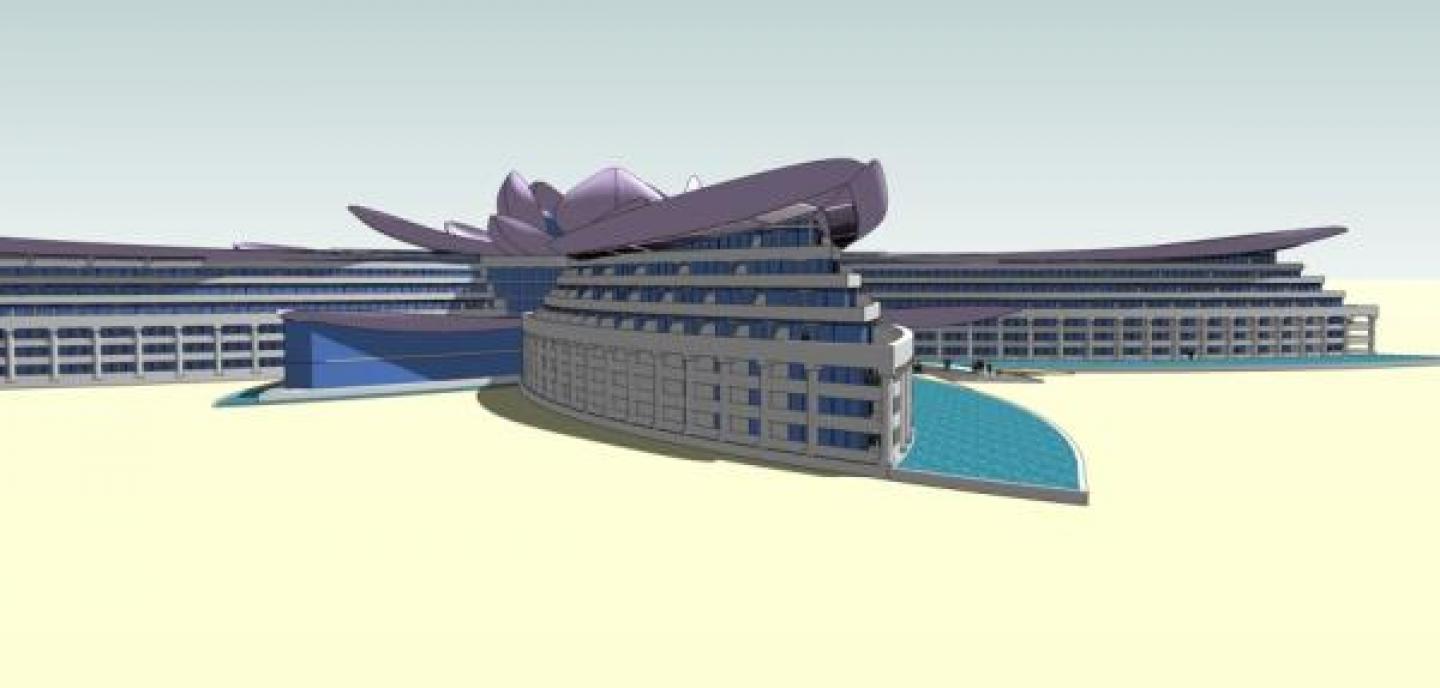 The shape of the hotel is inspired by the Lotusflower, well known and apreciated by the ancient Egypts. the terraceshaped leaves are providing space for at least 900 rooms, further functions as offices, wellness centre, entertainment, theatre, restaurants, etc. are present in the building. The building is part of a resort with a town, apartments and aquapark at the Mediterranean Sea between Marsá Matruh and El Alamein.