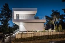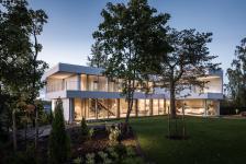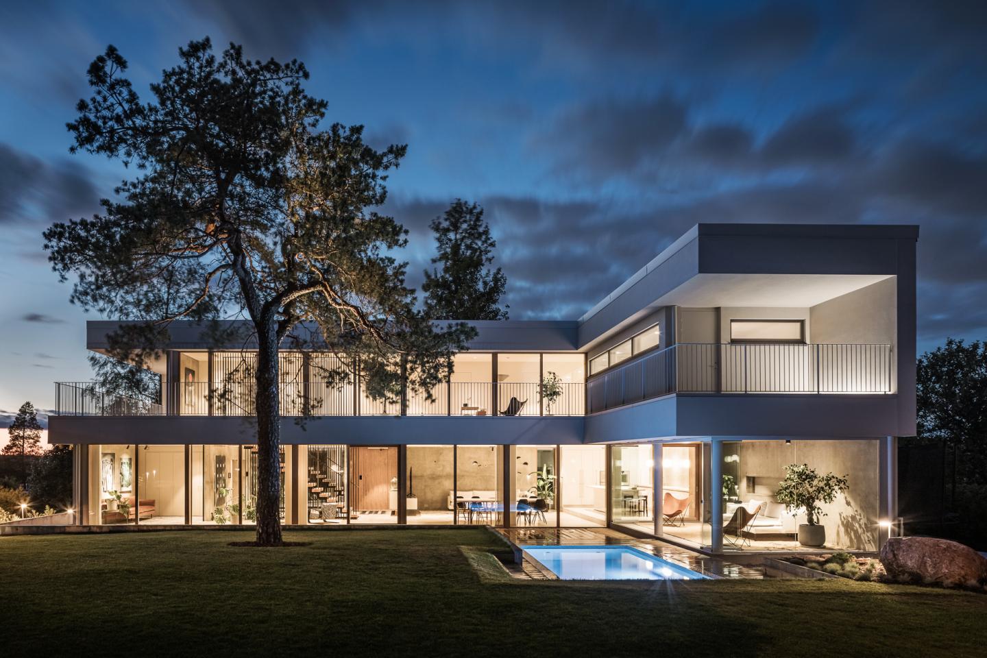 House J is situated on top of a high hill, on the edge of a single-family housing area. The architectural concept is based on the site: the building has a closed rear towards the North and East where the neighboring houses are, and it opens to the South and West, towards a natural forest. The house curves around an old pine tree, forming a lap with a sunny and sheltered courtyard. The free form and lush garden create a contrast to the rectangular building.