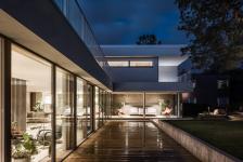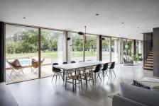The concrete load bearing walls are left exposed in the interior spaces. The window frames and doors made of oak, create a warm counterpart for the concrete surfaces. The artworks on the walls add a splash of color for the interior.