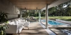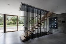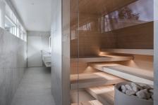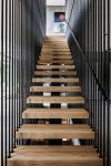 The floors are connected by an open stairway with wooden steps hanging from thin metal bars reminiscent of tree trunks in the nearby forest. The same theme of levitating wooden planks continues in the sauna room.