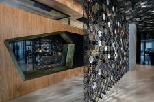 The reception area, which constitutes the beginning of the lounge area, has been provided implicit, airy separation in the form of a two-way grille partition made of metal construction containing hundreds of membranes in a random-dynamic composition. To this end, loudspeaker-like bodies were fabricated, on the backs of which real speaker membrane cloths by Bowers & Wilkins are attached. In addition, copper-colored panels have been integrated and carbon filament lamps have been exactly positioned in the gaps.