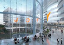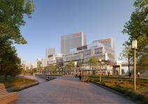 Plot A is comprised of the headquarters and supporting functions. Based on the principles of TOD, the design layout is expressed with a core traffic space around which other functions are distributed. The building is composed of five radial office building modules, extending to the riverside from a central open-air plaza. Each office module contains supporting facilities including service business, indoor basketball court and annular open-air courtyard to generate a work-live dynamic.