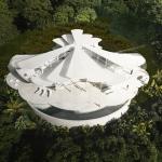 The sculptural form of the roof is inspired by the plumage of a bird and is generated by a very light structure.