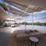 The way you discover the house and arrive to this central courtyard full of flowers , that acts as welcoming but also as gathering space , benefitting from the shadows generated by the sculptural roof ,