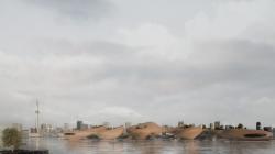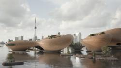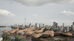 Inspired by the cross sections of nationally loved maple trees, the buildings take organic forms with open and green spaces on the upper levels mimicking the dark spots visible on cross sections of dead maple trees. These shapes get reduced by the size as they get closer to the sea surface, where they will be placed on bearing pilots reaching deep into the water.