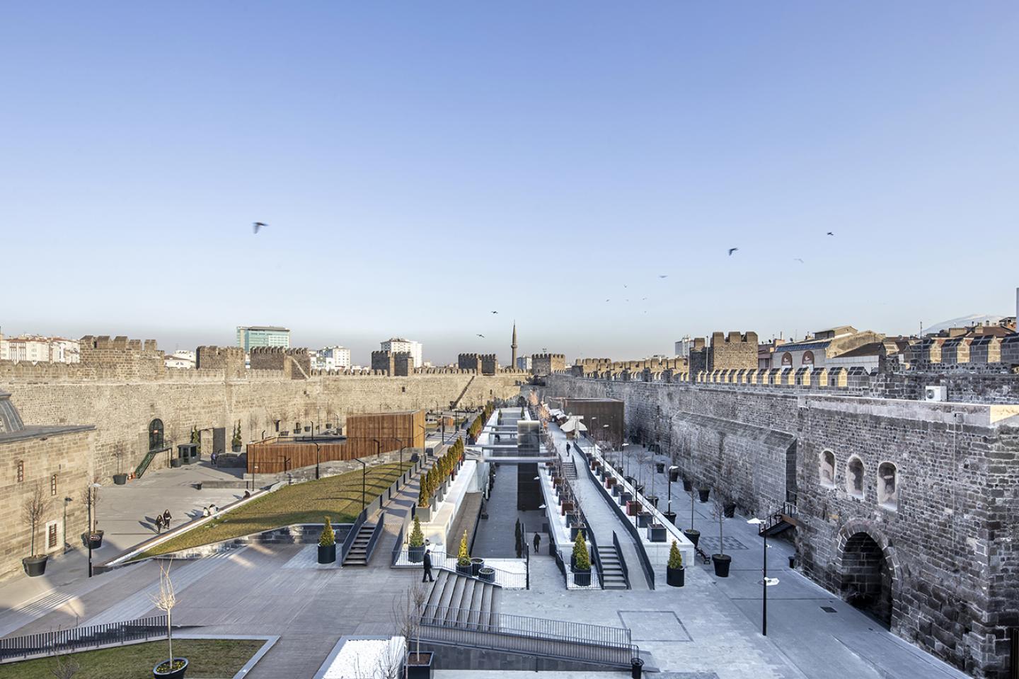 In the project of the transformation of the Kayseri Inner Castle into a Culture and Art Complex, the Inner Castle was accepted as an inclusive monumental museum, and the idea of observing the monumental structure from different perspectives and heights and creating a backdrop for each function were the key design principles that form the base of the concept. In the project, which is built around the inner street at the lower level, the Castle were intended to be perceived from the elongated-form gallery while climbing the stairs, and the Castle would be set itself as a backdrop behind each program element on the ground level. Along the inner street and at the ground level, two terraces parallel to the street and the different functional areas opening to these terraces complete the overall organization on the ground level and a spatial and functional organization is envisaged below. The basic organization in the project is based on the idea of a street that connects the Dizdar-Kitsh gates in the east-west side below the ground level. A wide staircase from the Dizdar gates accesses this street and another access is provided via a narrower one from the Kitsh gate. Above ground, a connection is established with the sunken street that cuts the castle horizontally. The green and hard-surface floors opening to the terraces on the ground level provide the integrity between the functions. There is a mosque inside the castle, opposite the Kitsh gate. By creating an axis between this gate and the mosque, a functional connection was established between the terraces and this axis; “the relationship and integrity for pedestrian” has been achieved between the terrace, the entrance and the mosque.