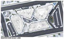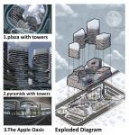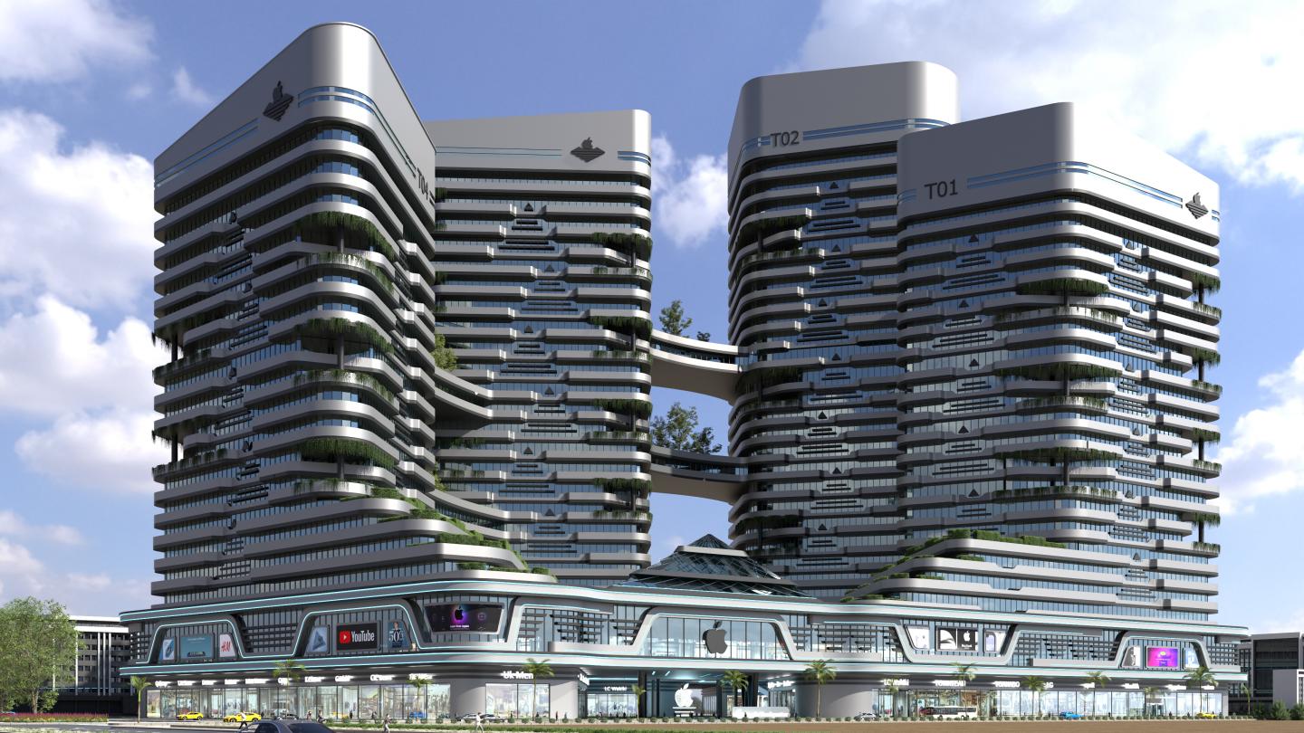 The project consists of the first and second floors, which are a commercial mall, and there is an Apple Store in the middle Then we move on to the upper floors. The project consists of four towers, each of them has a different function from the other. We start with Tower T1 of these towers is the administrative headquarters of Apple with a height of 20 floors As for Tower T2, it is a hotel-residential apartment with a height of 23 floors, and then we move to Tower T3 which is a hotel building with a height of 21 floors Then we move to the T4 tower, which is an office building with a height of 17 floors.
