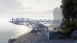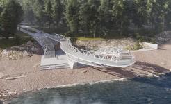 Completing the movement along the ring of the viewing platform, we go down. Here, the metal structure interacts with the base, inscribed in a kind of landscape consisting of large rocky stones scattered along the coastal strip. The complex solution of the podium combines the foundation supports of the viewing platform and several zones in space that make up the elements of the environmental eventfulness of walks along the lower level: an amphitheater and a staircase to the water; a kind of "delight" zone under the "arch" of the viewing platform console; and a place with an information wall dedicated to the history of the construction of hydroelectric power station. This concrete wall is adapted into a pile of shore stones, creating a protected corner, which is proposed to be completed with simple sawn timber elements that act as benches, creating a cozy area for contemplation or a solitary dialogue. From the coastal level back to the upper one, we climb another staircase leading to the central alley and again find ourselves in a pine forest.
