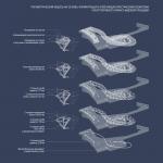 The image of the viewing platform, generated by natural associations, and its biomimetic metal structure, conditionally defined in space as a Möbius strip with the descent of one of its stairs down and the rise of the other up, are formed as a certain scenario of visual activities connected with the process of movement along the viewing platform. Walking along it, we start with a view of the automobile bridge, then, with a change in viewing angle, we look at the opposite bank with the route of a unique ship lift located on it, and further along the movement, we turn to the hydroelectric power station itself.