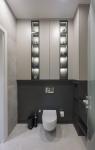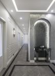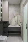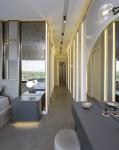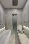 The master bedroom has two dressing rooms that are connecting to common master bathroom. Bedroom is designed in a luxurious way where dark grey and brass matches. The master bathroom has also a minimal hammam inside where continues as a bathtub. Ribbed marble is used to enrich the wall at the bathroom area.