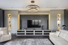 After a few meetings and moodboards with our client, the living room that is 55m² is designed around TV that will be used as playstation with a large cabinets in order to store the related equipments. Walls have been covered with wood joints where continues in whole house.