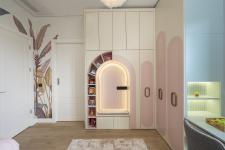 Children rooms are designed with the harmony of pink and green colors where the curvilinear forms matches with rustic brass. Corridors have the same wall language in order to carry harmony to the whole house. Powder room has a luxurious style with rustic brass mirror ans wall coverings.