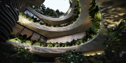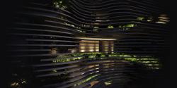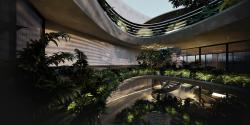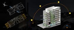 Simulating the architecture of natural leaf veins, we have created a "Double-skin" solution for the building with irregularly curved laminar system using precast lightweight concrete material. This cover is calculated to block all direct sunlight affecting the building and reduce the direct visibility to those unsightly surrounding landscape. The ripples and splits of the sheath simulating the softness of the leaves, providing a visual sense of movement while allowing the incorporation of naturally growing interspersed vegetation. Through microclimate analysis of the building, we decided to open a large atrium core at the center to create a natural "Aqua-terrarium". This solution solves the natural air convection problem for resident living spaces, and this is also the place to regulate the central temperature and humidity for the building. The vertical axis of the cavernous core begins with a large waterfall lake on the first floor that acts like a moisture diffuser.