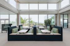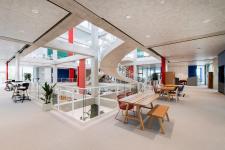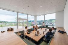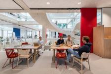 In addition to fitting out the open plan areas, the architects also designed a sophisticated cafeteria on the ground floor and three special meeting rooms on the top floor. The Amphitheatre, equipped with custom-made stepped seating, is a popular choice for presentations and open group discussions, while the Campfire facilitates quality conversations, creating a slower, more reflective exchange. The Tea House is designed as a conversation area consisting of a sunken sofa and a large table and is specifically created to foster a strong sense of group work. Conversations, learning and exchange happen here in an informal atmosphere. In accordance with the most sophisticated tea ceremony traditions, this is a shoe-free area.