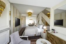 Ribbed forms are emphasized in order to explain the luxury in a modern way. This combination ending with bronze mirror on the walls with pad complements. Gold ribbed dressing table is focused with Its uniques style where two armchairs are facing the sea.