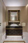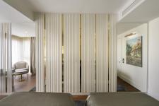 The room is designed in a fluent way of the whole apartment with following the effects of pvd, white lacquered. Bronze mirrors with the combination of pad laths are bringing a movement on the walls.