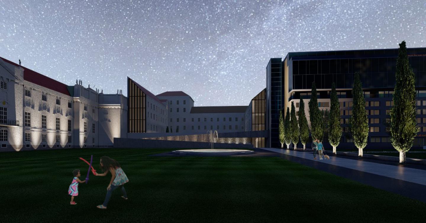 To preserve privacy and enhance environmental quality, a screen of cypress trees relocated from the monastery has been created, which hides the hotel and enhances the space between the palace and the monastery. The water fountain of the Trautson Palace as a focal point, recalls the historical image as an aesthetic and sensory element of the environment.