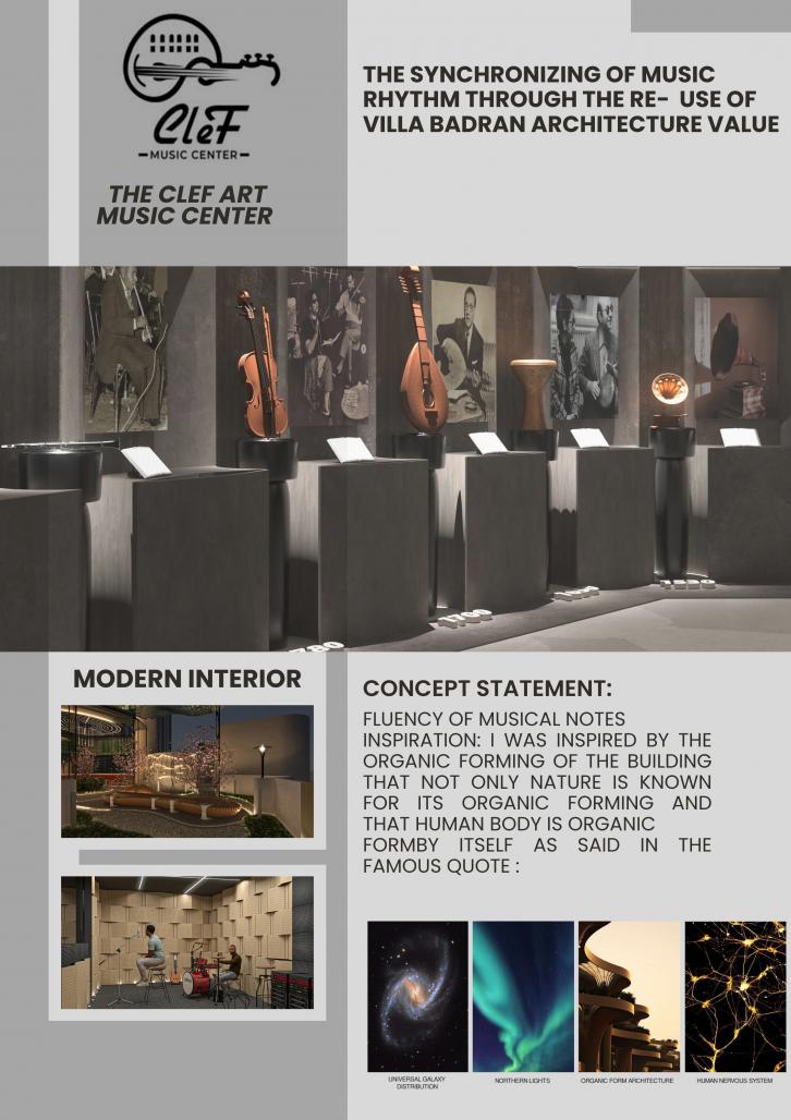 This project is an adaptive reuse project and the result we aspire to have is to renovate Villa Badran from its current state into a more purposeful building and that to be is a music center due to the lack of this type of buildings in the area and this will be done by using the organic design of the building and the form of musical notes. Choosing this function was because the area have a lot of schools ad have heavy people traffic so it can help culturize people specifically at young ages and school kids can be more educated about Egyptian history in music . the main zones were chosen to show the variety this center can give to the community like entertainment , educational , relaxing , culturizing areas that may needed .