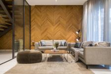 A partitioning glass wall defines the main living area. Aside from a wide glazed wall draped in soft drapes, a wooden feature panel front of which the furnishings are arranged gives a sense of ease and cheerfulness to the entire space. Choosing the right textures and colours, along with soft seating, mild lighting, and other components, results in an inviting, informal gathering space.