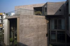 A dance of Cubes - Two interlocked apartments, the front duplex for the parents, and a rear triplex for their daughter and her children, derive strong reference from the form of a ‘Mashrabiya,' traditionally an integral part of the Arabic lifestyle, albeit in a new avatar. The proposed three juxtaposed insulated concrete cubes of varied sizes engage with the external environment, with the street, create space below, above, and around them, frame the sky, and are in constant tension. Yet, these ‘sculptures’ maintain the indoor privacy of the occupants and ensure that during the day, parts of the large exposed building surfaces are shaded. Traditionally, ‘Mashrabiya’ were enclosed with carved latticework in wood, while the proposed ‘Jalis’ were constructed in lightweight metal to control daylight, ventilation, reduce energy consumption, and create beauty.