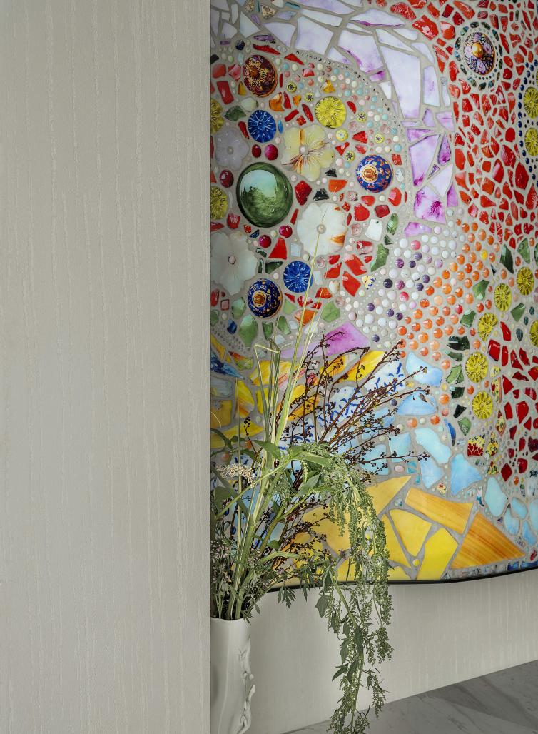 With the living room as the visual centerpiece, colors cascade down like a waterfall, converging into a serene lake, imbuing the entire space with a potent life force. An expansive resin mosaic graces the living room's TV wall, a creation by the design team that serves as a declaration of the space's spirit: warmth, abundance, and love. It is set to become the constant backdrop of life in this environment.