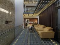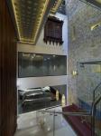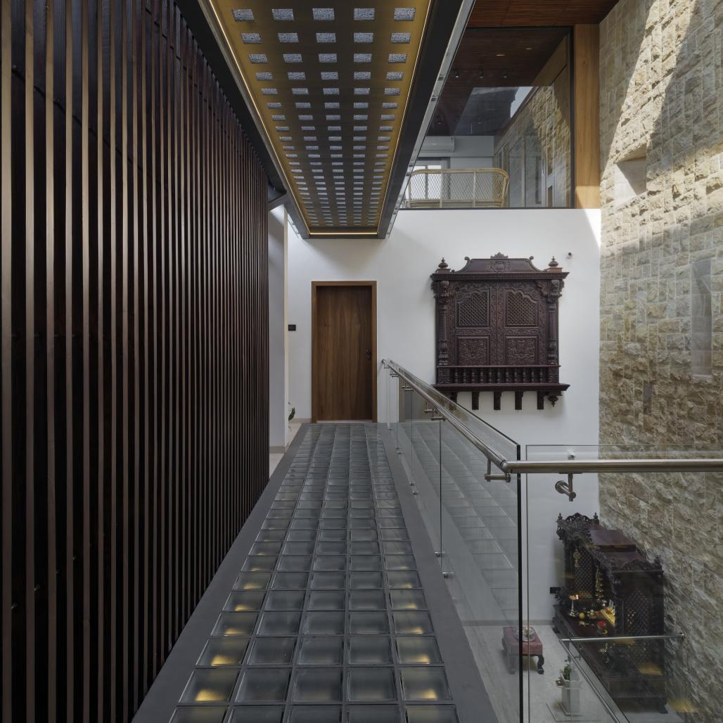 The residential part of this building forms the home for a family of six. It was ensured that there is a visual connection among all the levels to give the building a homely, homogenous feel. There was complete freedom in the selection of the material, whether natural or machine-made. Hence the feature wall in Gokak stone for the entrance lobby, which equals the height of the building, glass-block bridges connecting the two wings of this building on all the levels, and brick cladding on the external walls with a vertical screen façade to act as an extra barrier to extreme climate.