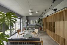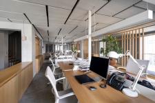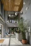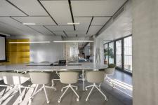 Contrary to the pace of working action, the objective of design is tranquility. The tone-on-tone color scheme and texture transitions lead to an elegant, calm atmosphere. The neutral colors of greige (grey/beige) are slightly enlivened with a pinch of colorful furniture. While the familiar, natural material selection (consisting of marble, oak, felt, terrazzo, concrete, and iron) aims to excite with uncommon uses of their application, like a ribbed marble or a corrugated concrete surface.