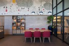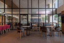 iculously designed with carefully integrated elements, the lobby, cafe, gym area, and conference room on the ground floor are all thoughtfully crafted spaces. The attention to detail is evident in the chosen materials for each space, as well as in the use of efficient, sustainable, and ergonomic furniture. In the lobby, the presence of a photograph featuring a Dutch monument subtly references the European influence on Surat’s art and architecture. The cafe's minimalist, refined, and cosy space exudes a contemporary chic atmosphere, with wooden elements and pristine white walls that combine to create a soothing and inviting ambience. An accent wall featuring brick cladding and wall art above the lintel level adds to the charm and character of the space. In the gym area, motivational artwork serves to cultivate a positive mindset among fitness enthusiasts. The conference room is a space of comfort and productivity, with functional furniture and modern lighting that allow for seamless collaboration.